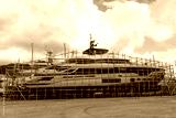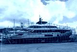 Luxury super yacht ashore on ship repairing yard. Yard period. Repairing. Motor yacht.