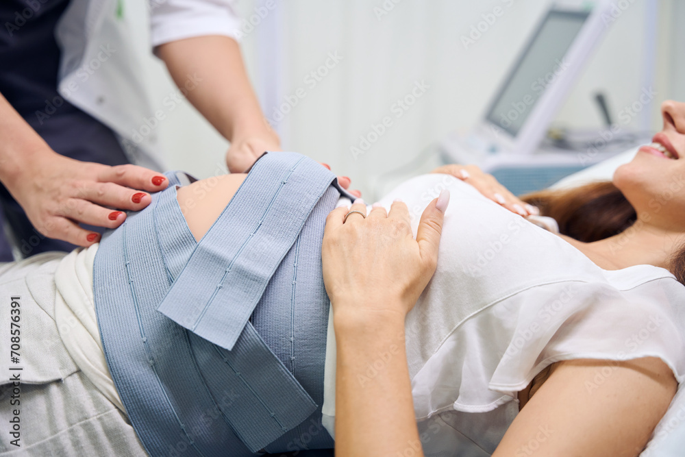 Partial female gynecologist preparing belly of smiling pregnant woman for ecg