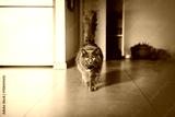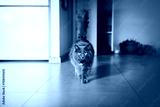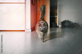 The domestic cat looks into the camera and walks. Modern interior. A Soft and Touchable Grey Cat Captures Attention with Its Focused Gaze and High Raised Tail