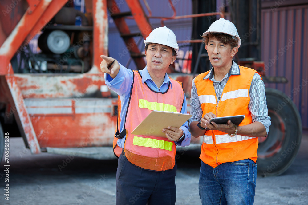 factory workers or engineers talking about project work and pointing to something in containers warehouse storage