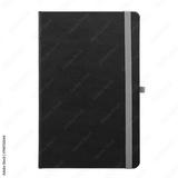 Black Leather Organizer, Daily Notebook with Pen Holder isolated on white background. Stylish daily planner with green colored rubber pen holder, clipping path. Isolated background