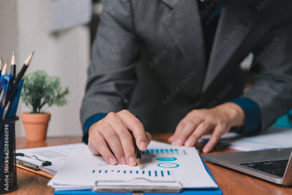 Businessman pointing chart analysis document and paperwork financial plan marketing with laptop on desk office..