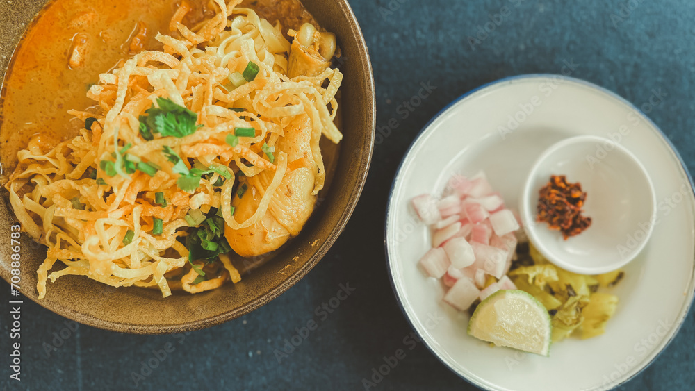 Northern Thai food it called Khao Soi Kai, egg noodle soup with chicken and a mix of deep fried egg noodles served with pickled mustard greens, shallots and lime