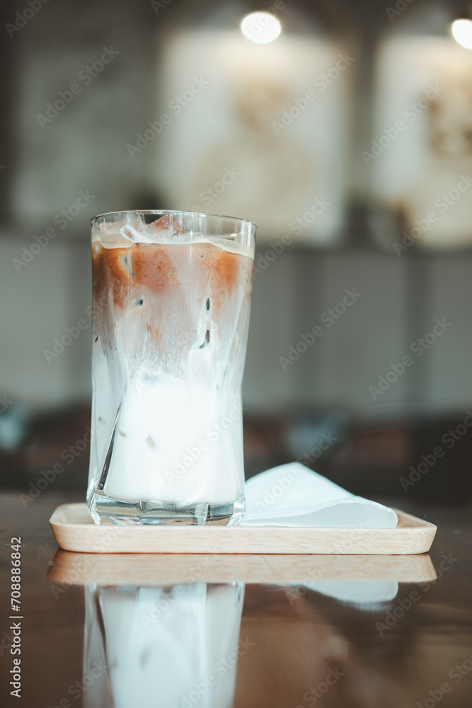 Refreshing summer drink concept. A glass of ice mocha show with beautiful texture and layers fresh milk and coffee.