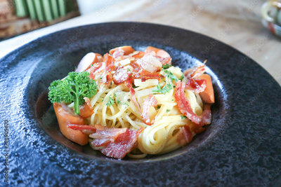 bacon and sausage spaghetti , pasta or spaghetti carbonara