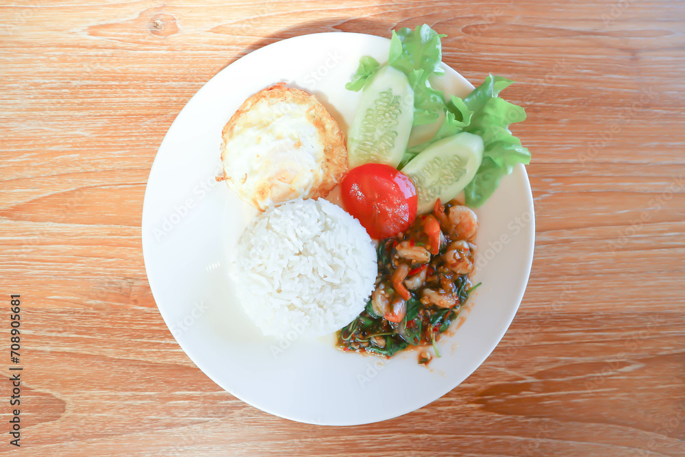 stir fried shrimp or stir fried prawn with holy basil ,rice and fried egg