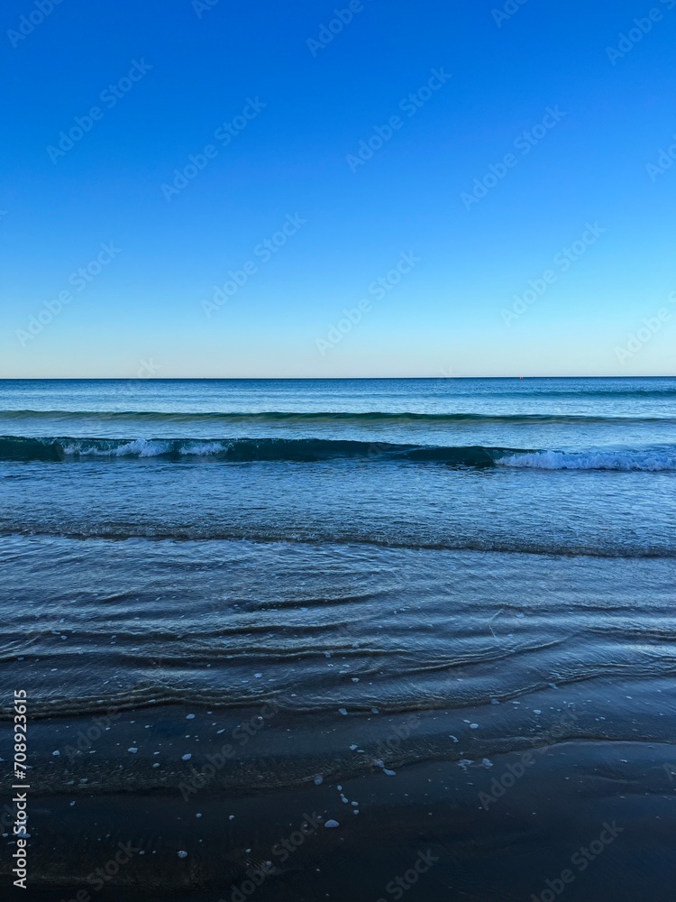 Blue seascape background, clear blue sky and blue sea horizon