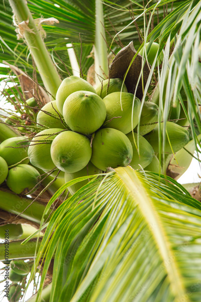 Load of fruits, upward view cluster of young green coconuts hanging on tree top with lush green foliage branch at tropical garden in Nha Trang, Vietnam, organic palm tree ready to harvest