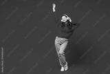 Full body young woman she wearing knitted sweater white hat casual clothes listen to music in headphones dance raise up hand isolated on plain red color background studio portrait. Lifestyle concept.