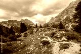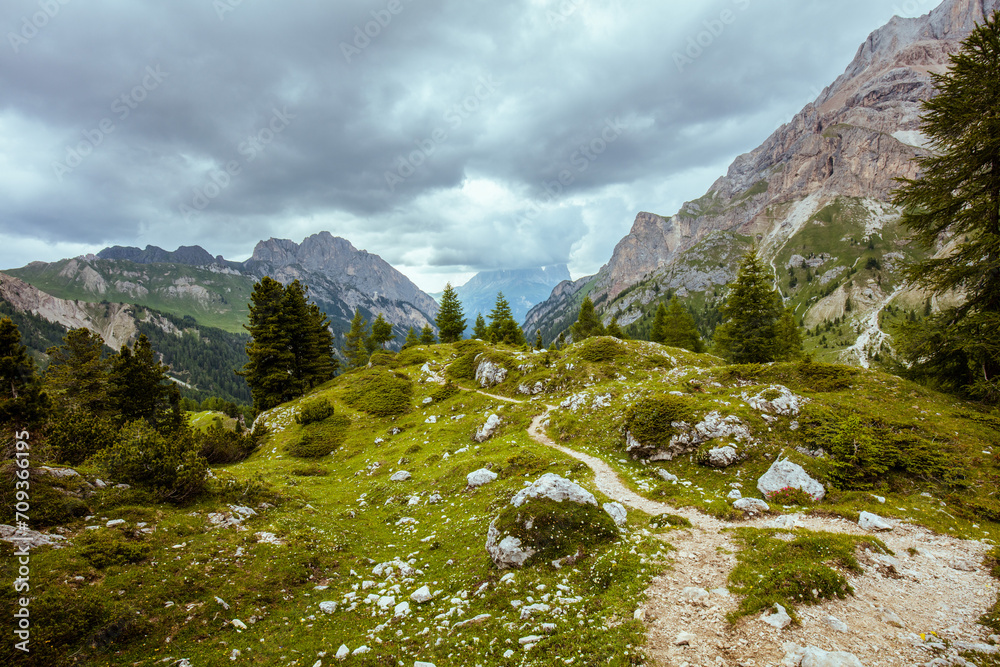landscape with mountains, hills, clouds, rocks, trees and trail