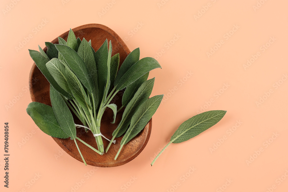 Sage Leaves or Salvia officinalis foliage on Wooden Plate.