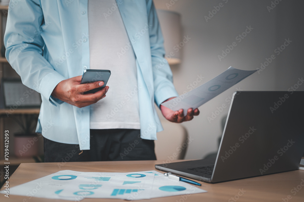 business, chart, pie, graph, investment, finance, diagram, pie chart, financial, growth. man hold report and reviewing financial reports for a return on investment charts at workplace to find mistake.