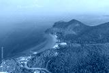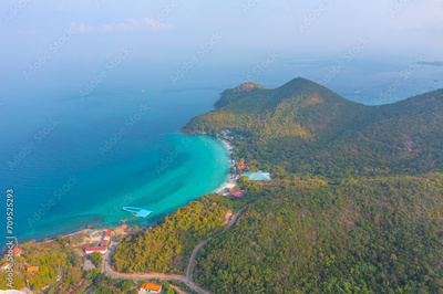 Tropical island with a sandy azure bay and pier and a beach village settlement surrounded with roads by exotic green forests trees hills, aerial view