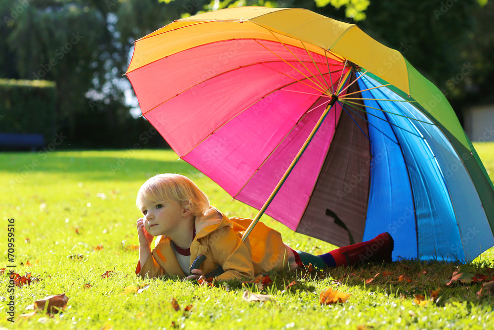 Portrait of small preschooler girl with colorful umbrella