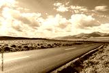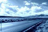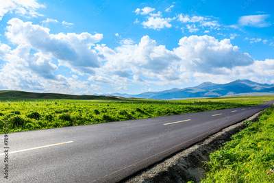 Country road and green meadow with mountain nature landscape under blue sky