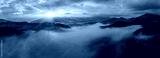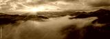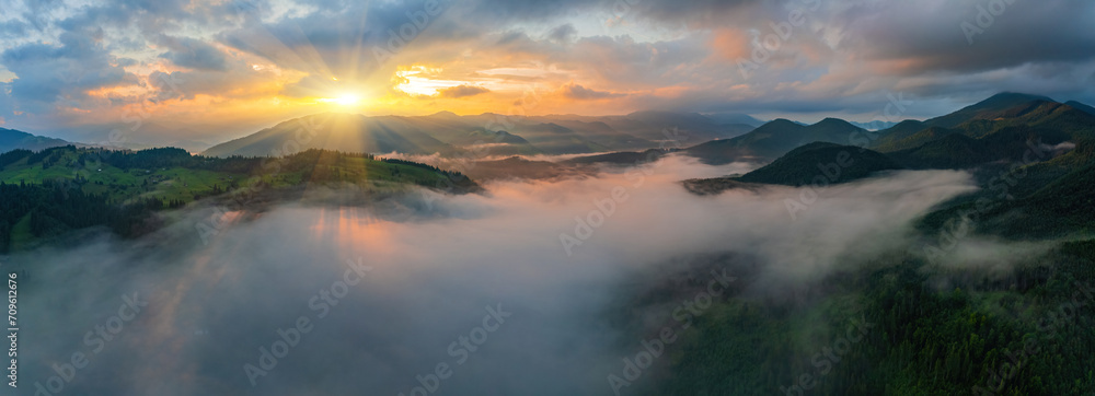 Amazing morning fog in the mountains. Beautiful sunrise light shines on the red beech forest. Drone panorama.