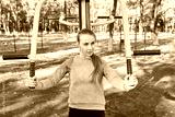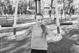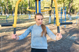 The sportive girl is engaged in fitness outdoors on sports simulators