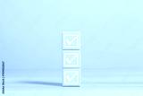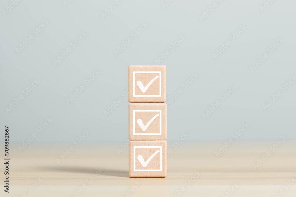 Wooden blocks display checkmarks to summarize task details and compile lists, votes, and to-do lists. Checklists, task lists, lists, and summaries Select document checklists and online quality assessm
