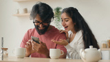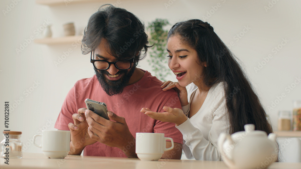 Excited multiethnic family Arabian indian man and woman looking at mobile phone screen at home kitchen happy couple girl and guy make order winning achievement shopping online with smartphone laughing
