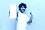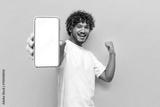 young curly indian man shows blank smartphone screen and rejoices in victory on yellow isolated background, guy wins online and celebrates success with phone