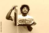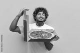 young hungry indian guy holding a box of delicious pizza and smelling the smell on a yellow isolated background, the man shows fastfoot and smiles