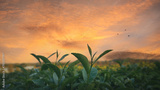 Green tea tree leaves field Fresh young tender bud herbal in farm on summer morning. Sunlight Green tea tree plant camellia sinensis in organic farm. Close up Tree tea plant green nature in morning