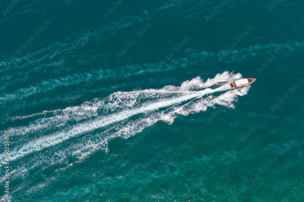 High speed boat rushing along the water surface of warm tropical waters, transfer of tourists. Aerial top view above