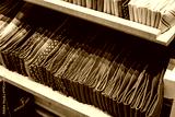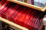 Ties of red shade and warm tones with strict design pattern are folded in row in the window of fashionable mens clothing store.