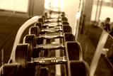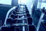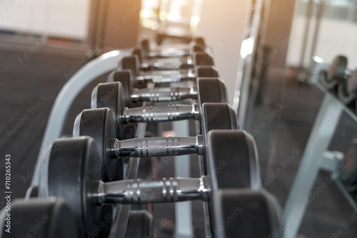 Rows of chrome metal dumbbells in the gym of modern dumbbells equipment in the sport
