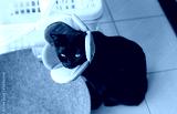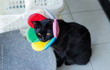 Portrait closeup full body shot of small black kitten cat with yellow eyes sitting posing look at camera on tile floor in front of white basket wearing colorful fashionable flower collar