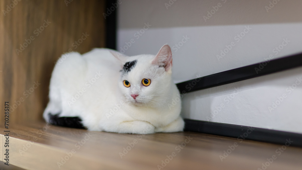 Closeup full body shot mature small domestic white kitten shorthair feline pet cat with black marking and yellow eyes laying lying down on shelf