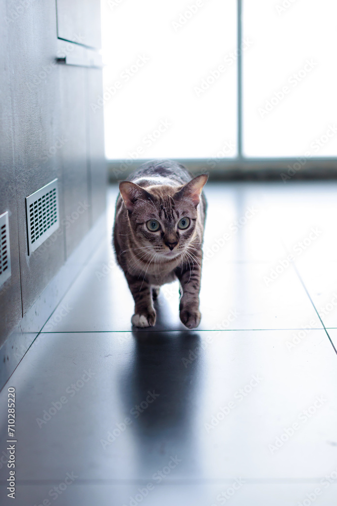Portrait closeup full body shot mature loafing brown and gray striped tabby domestic kitten feline shorthair pet cat with yellow green eyes walking on tile floor sneaking near black wall inside home