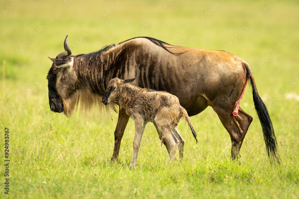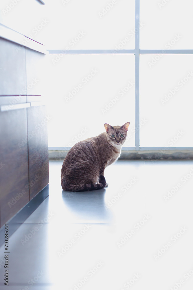 Portrait closeup full body shot of mature loafing brown gray striped tabby domestic kitten feline shorthair pet cat with yellow green eyes sitting posing on tile floor looking at camera inside home