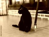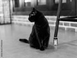 Closeup full body shot of mature small domestic pure black kitten shorthair pet cat with yellow eyes sitting posing resting relaxing looking watching on floor near chair in front brick walls at home