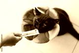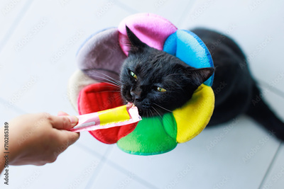 Closeup top view shot of mature small domestic pure black kitten shorthair pet cat with yellow eyes wearing colorful fashionable flower collar sitting licking biting feline treat from owner hand