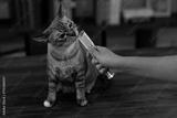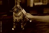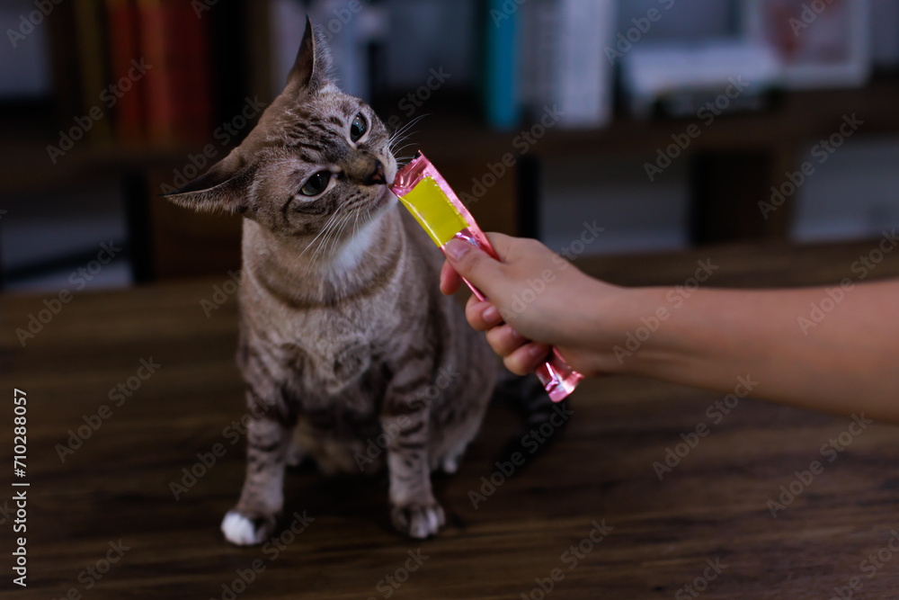 Closeup full body shot of mature purebreed small brown and gray striped kitten cat with blue eyes sitting posing on wooden table stick tongue out licking feline treat from unrecognizable owner hand