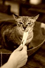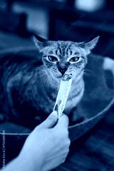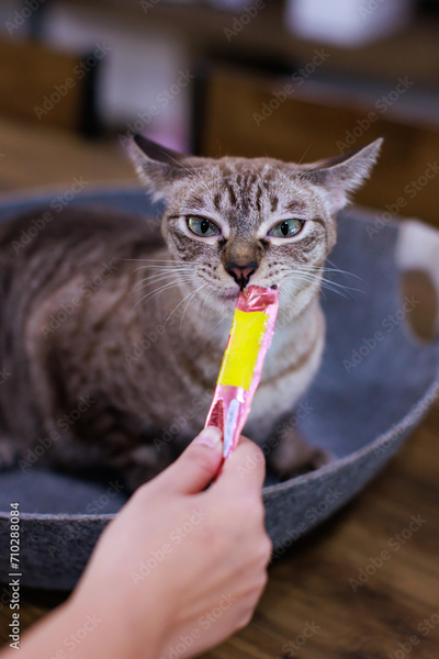 Closeup full body shot of mature purebreed small brown and gray striped kitten cat with blue eyes sitting posing on wooden table stick tongue out licking feline treat from unrecognizable owner hand