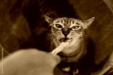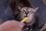 Closeup full body shot of mature purebreed small brown and gray striped kitten cat with blue eyes sitting posing on wooden table stick tongue out licking feline treat from unrecognizable owner hand