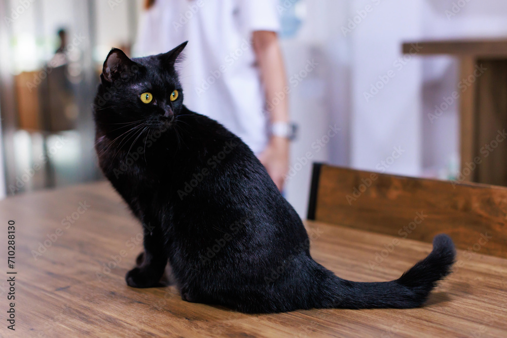 Portrait close up full body shot of small black kitten cat with yellow eyes sitting posing look at camera on wooden table