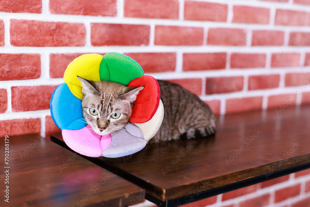 Closeup shot domestic striped tabby kitten shorthair feline pet cat with yellow green eyes wearing colorful fashionable flower collar laying lying down on wood shelf in front brick wall