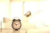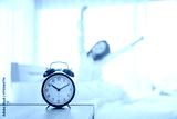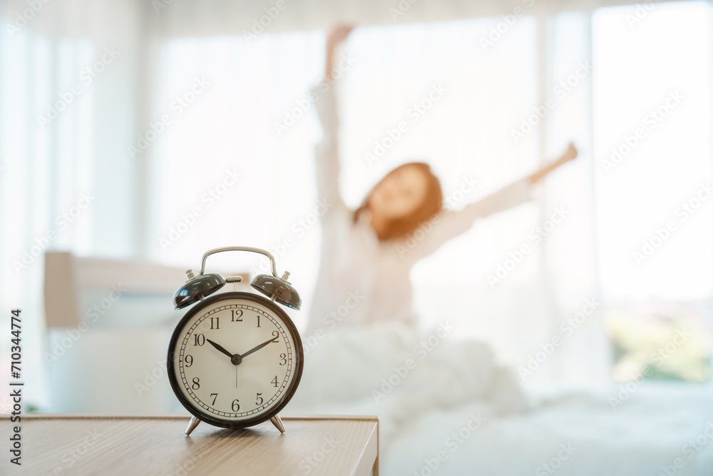 Young woman at home in morning, focus on alarm clock, alarm clock wake up woman in the room