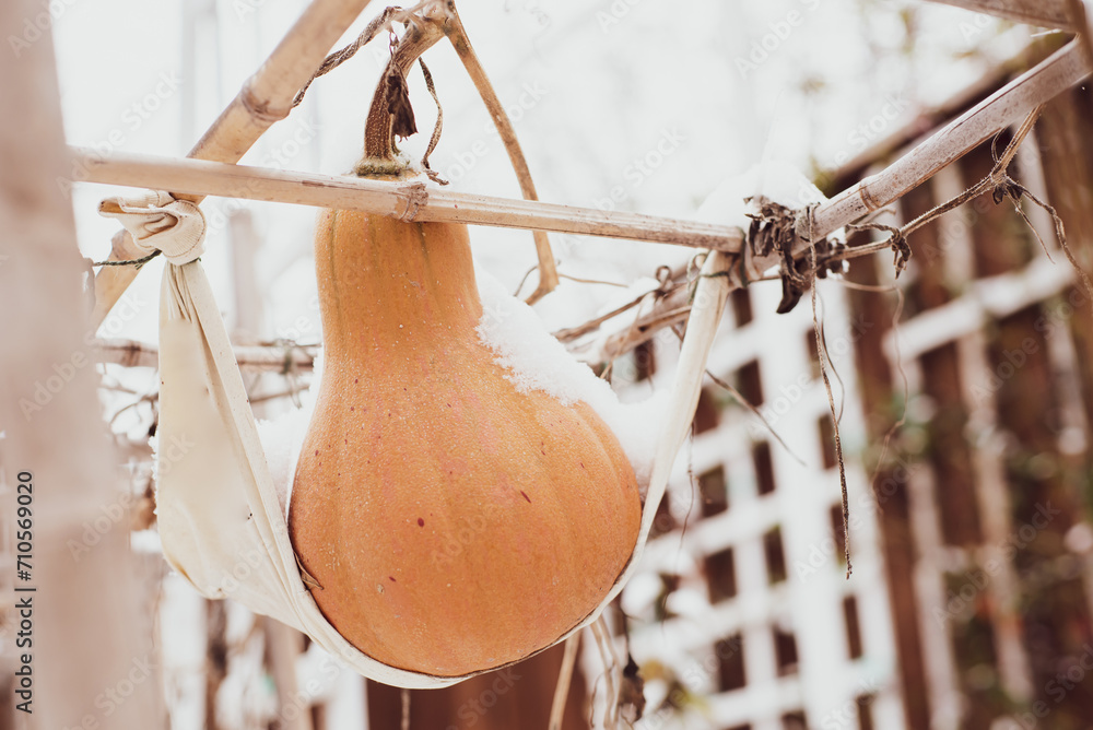 Lookup view large Seminole pumpkin butternut squash covered in snow on handmade hammocks ties to bamboo trellis support at backyard garden in Dallas, Texas, USA, winter harvest background
