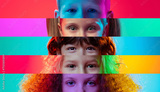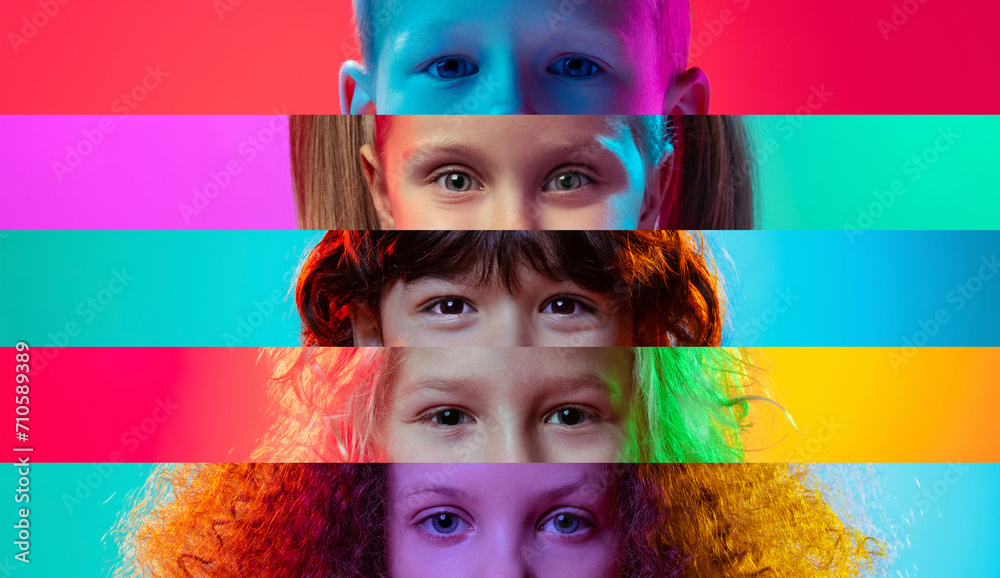 Set of children's eyes placed on narrow stripes over multicolored background in neon light. Concept of childhood, emotions, lifestyle, diversity