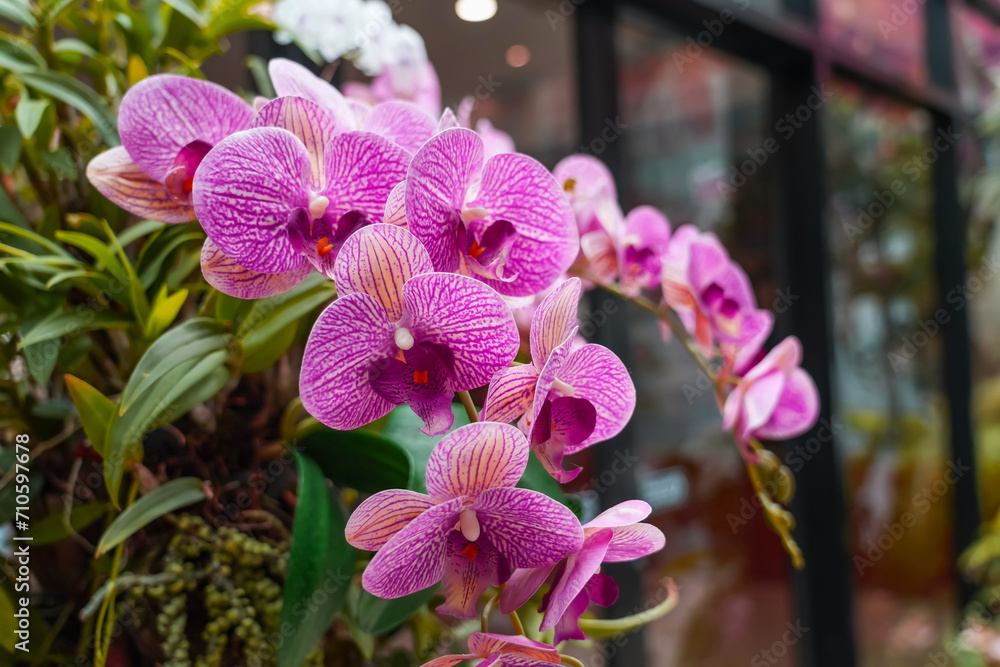 Beautiful Phalaenopsis pink purple orchids with beautiful flowers and green leaves.