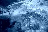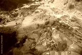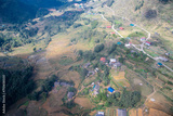 Terraced paddy field after harvest, traditional ethnic houses, mixed modern homes along main road of Muong Hoa valley, with Hoang Lien Son Mountain range background, Sa Pa, Lao Cai, Vietnam