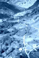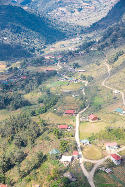 Terraced paddy field after harvest, traditional ethnic houses, mixed modern homes along main road of Muong Hoa valley, with Hoang Lien Son Mountain range background, Sa Pa, Lao Cai, Vietnam