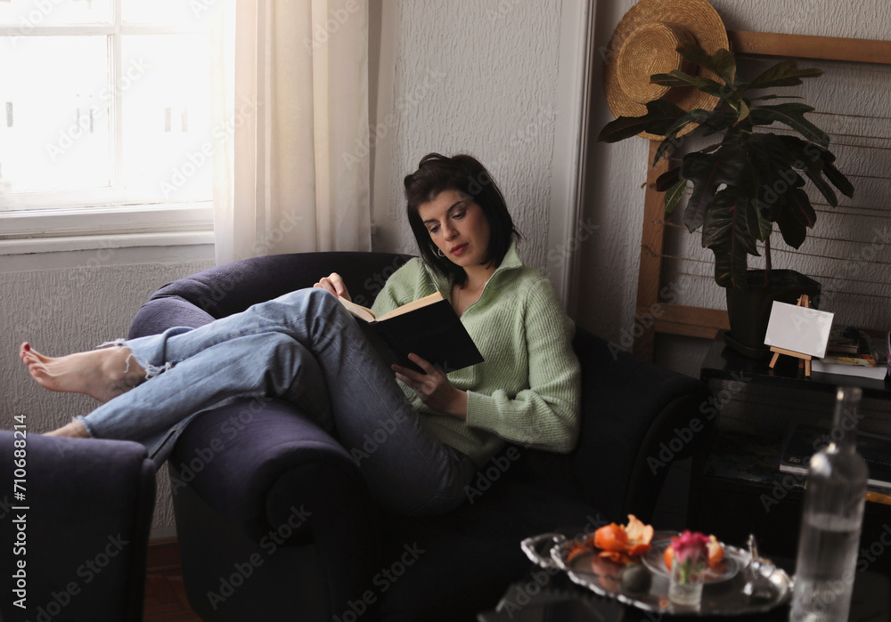 Woman reading on the armchair. Woman sitting on the armchair and reading a book.