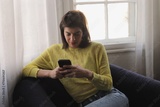 Woman typing on her cell pone Beautiful woman looking at her mobile phone.