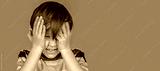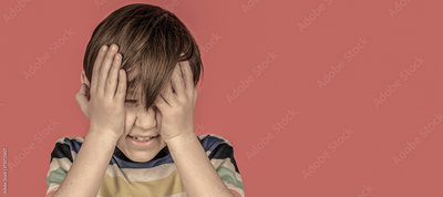 Portrait of a sad boy holding his head with his hand, isolated on the red background. Little boy having a headache