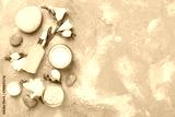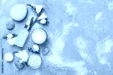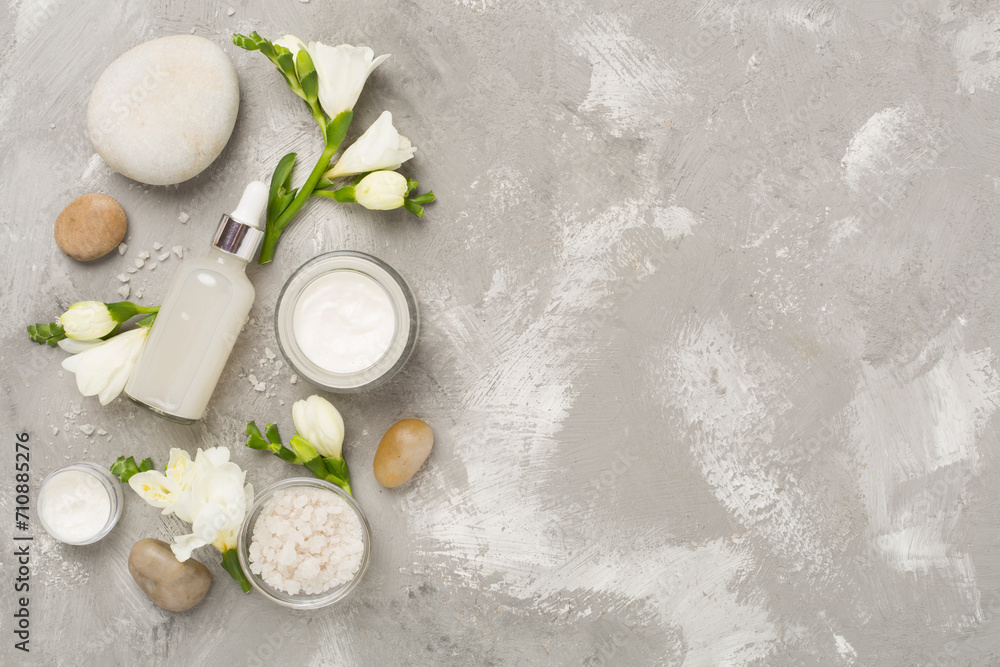 Flat lay with spa products and flowers on concrete background